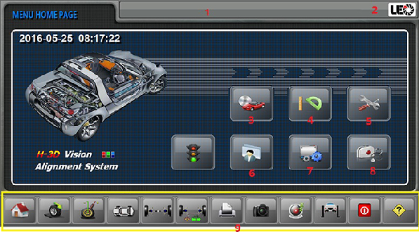 9. System short key including main menu, wheel alignment, data screen,rear wheel adjustment, front wheel adjustment, printer, camera viewer, screen saver, vehicle driving guidance, exit the software and help document.